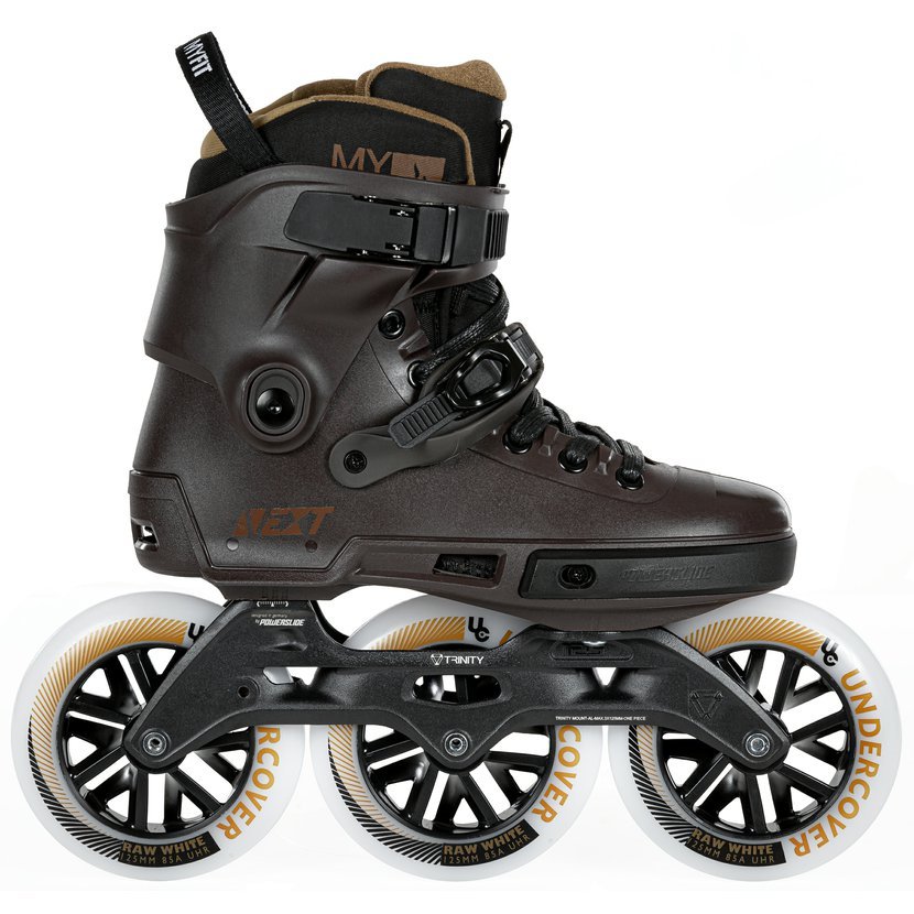 Kolečkové brusle Powerslide Next Brown 125 Trinity tyto brusle mají klasický nadčasový vzhled, jsou dokonalou kombinací výkonu a pohodlí, mají vyšší těžiště, dobrou ovladatelnost a zvládají jízdu i na horším povrchu. Tento model je vybaven pevným litým rámem z hliníku, extra kvalitními kolečky Undercover o průměru 125mm s tvrdostí 86a a ložisky WCD Freespin Abec 9. Jedná se o největší velikost koleček z kategorie friskate.