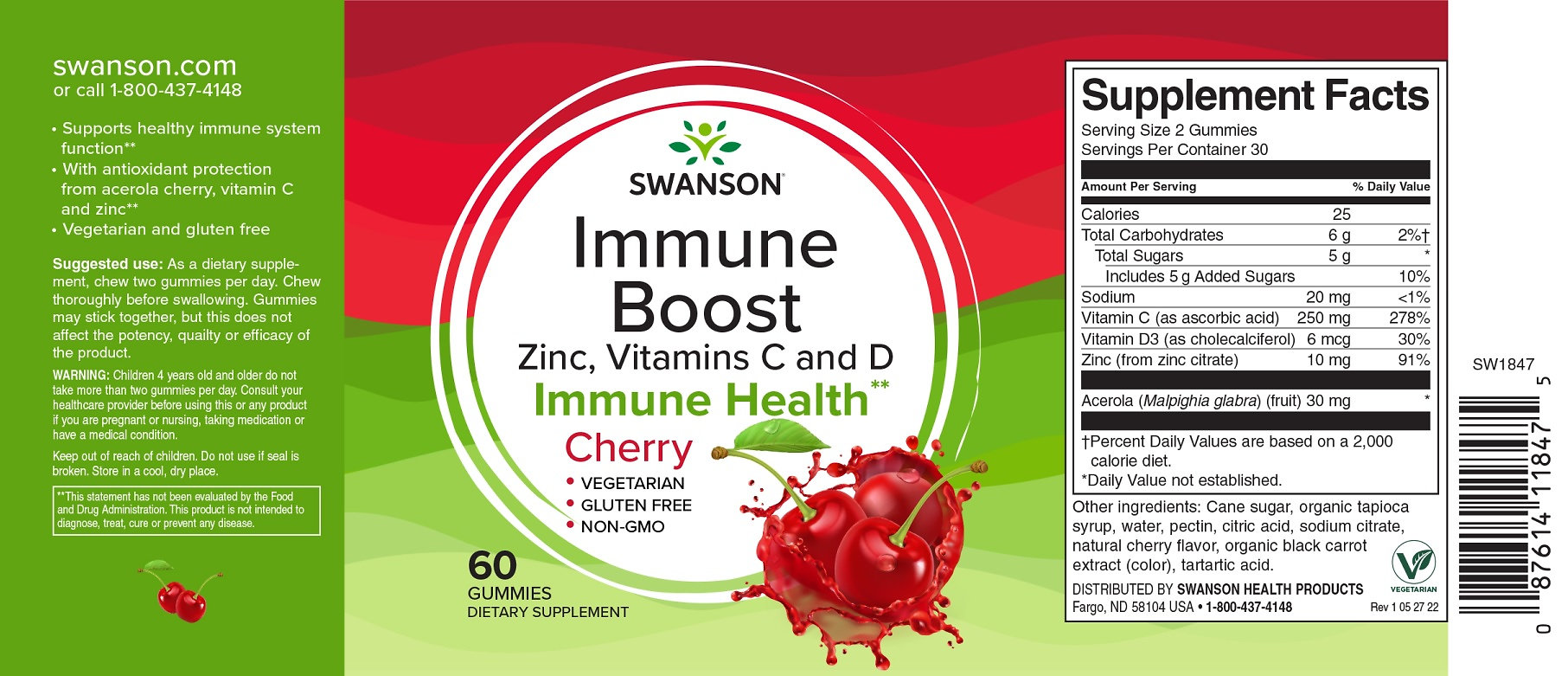 Swanson® Immune Boost s Acerola Gummies je lahodný a vegetariánský doplněk stravy, který obsahuje antioxidanty z aceroly, vitaminu C a zinku, které chrání organismus před volnými radikály a posilují imunitní funkce.