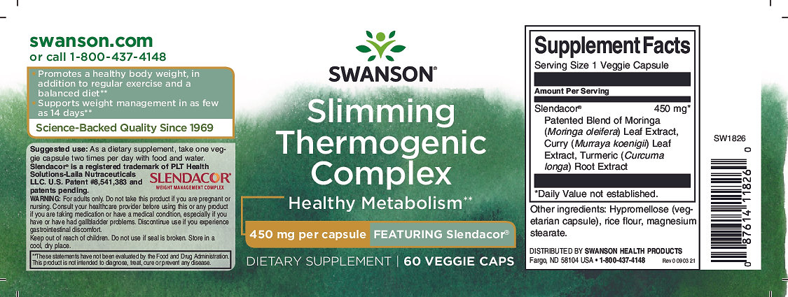 • Swanson Slimming Thermogenic Complex obsahuje patentovanou směs Slendacor®, která kombinuje extrakty z kurkumy (Curcuma longa), moringy (Moringa oleifera) a listů kari (Murraya koenigii). Tyto bylinky mohou: